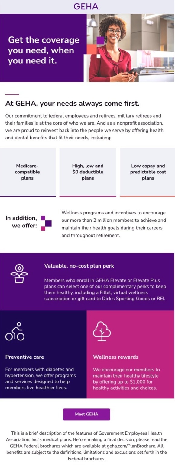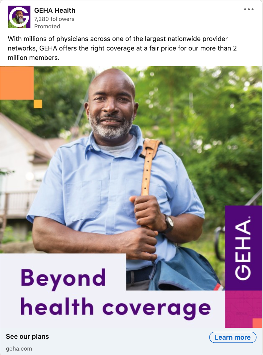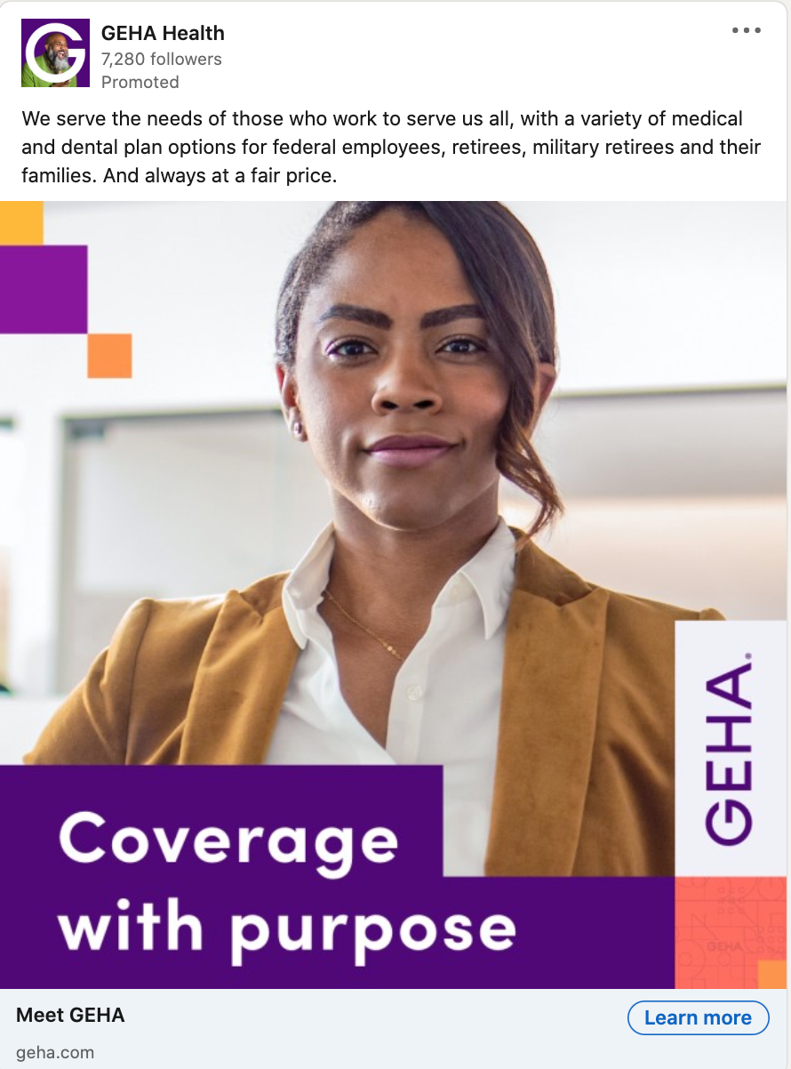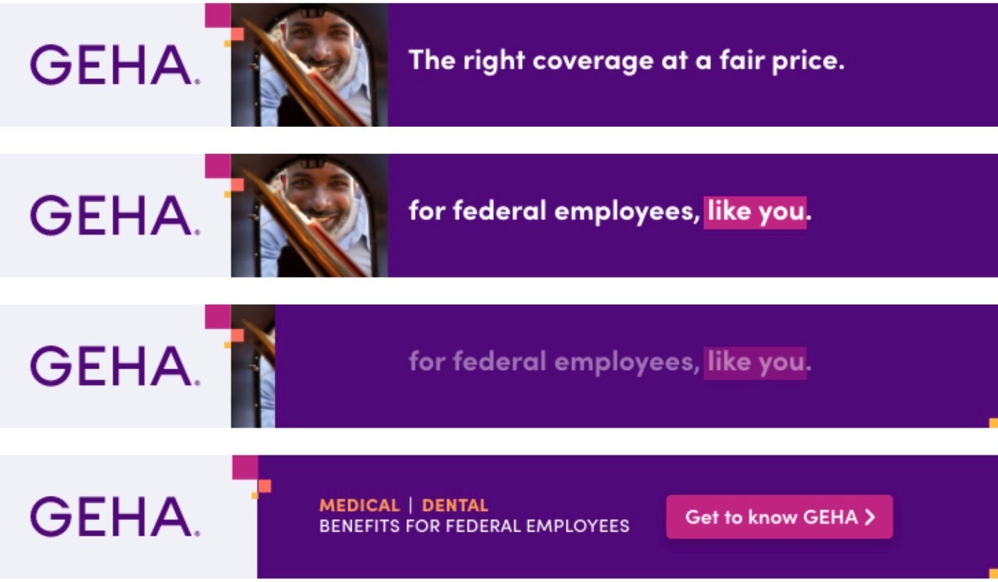 To raise awareness of GEHA, a health benefits partner that provides coverage specifically for federal employees, retirees, and their families, we created a series of banners, and social posts that highlight benefits, including a variety of great benefits at a fair price.