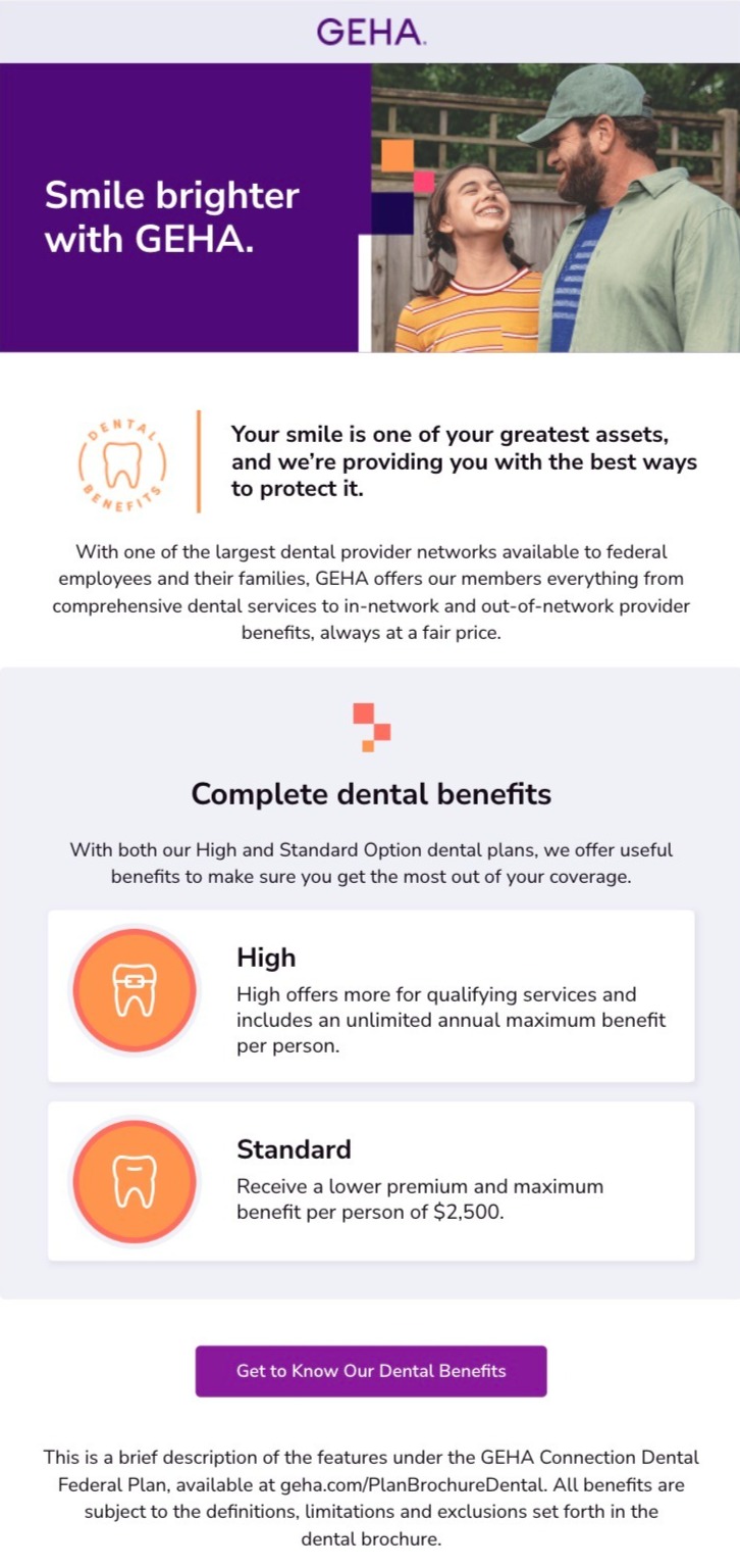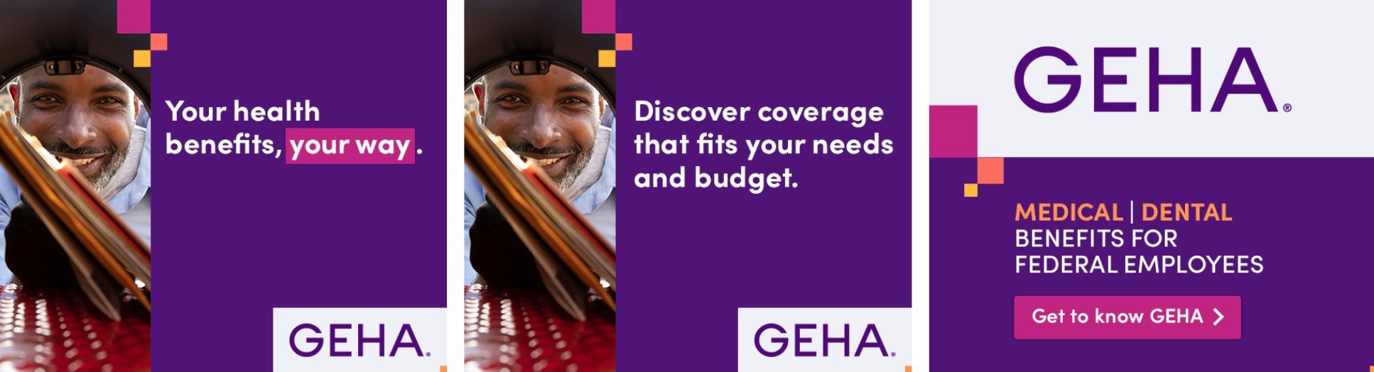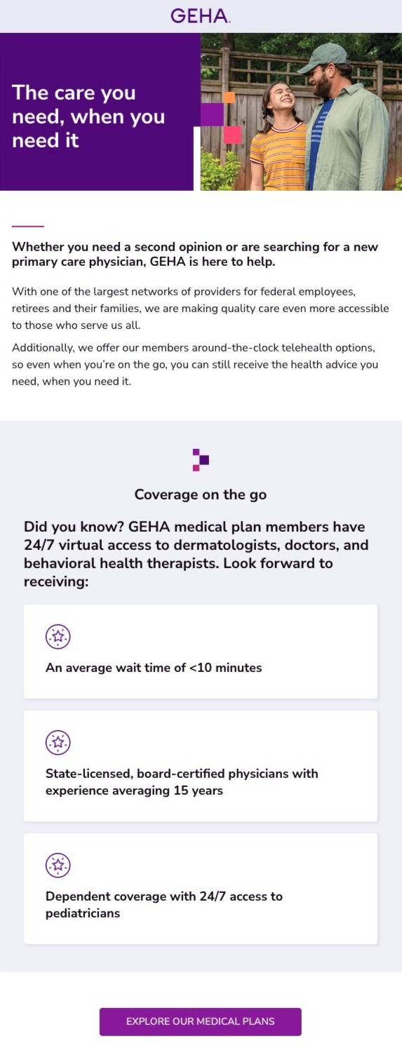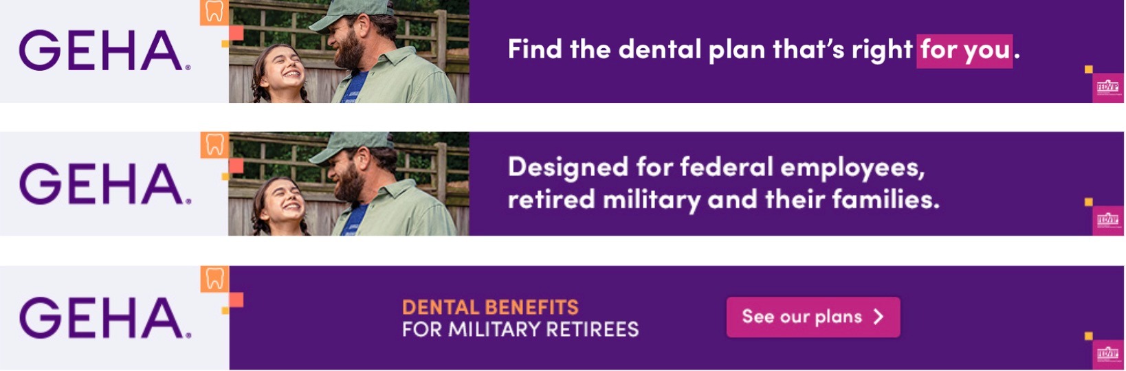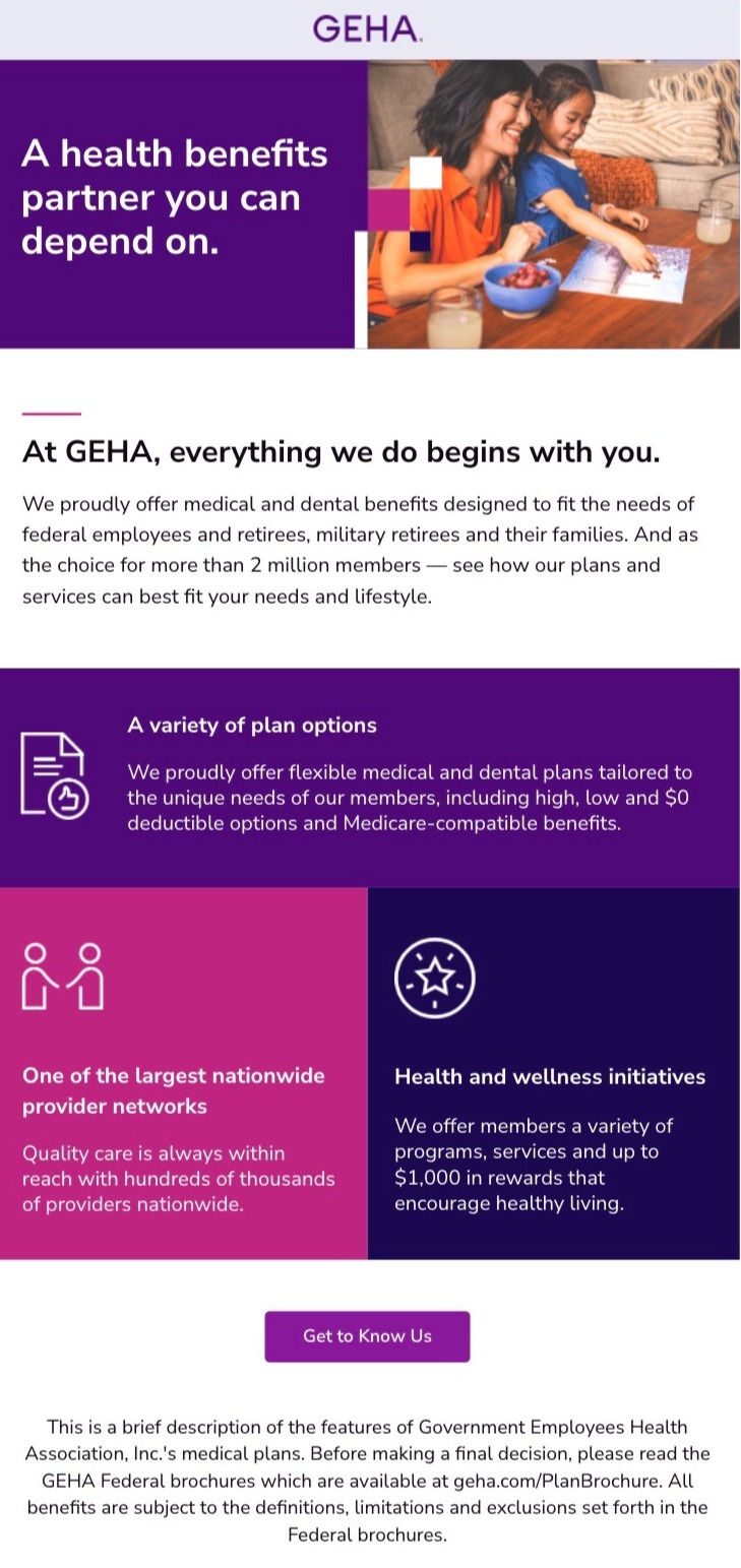 To raise awareness of GEHA, a health benefits partner that provides coverage specifically for federal employees, retirees, and their families, we created a series of banners, and social posts that highlight benefits, including a variety of great benefits at a fair price.